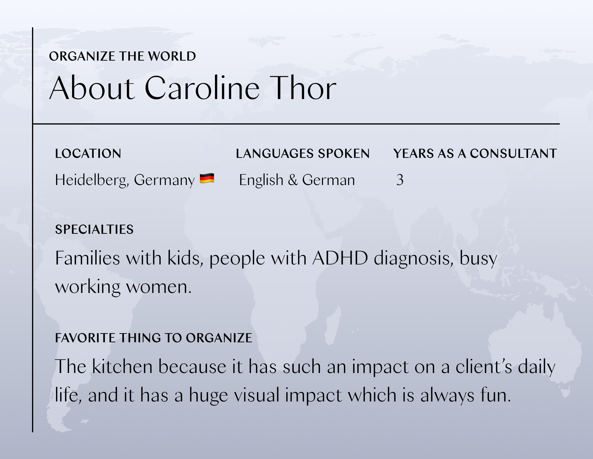 Before becoming a KonMari Consultant, Caroline Thor was a trained teacher who ran a small business teaching classes in English to expat families and kids in Germany. When the pandemic hit, classes stopped, giving Caroline some unexpected time to consider the next phase of her life. She was 48 at the time, with three kids at home, including a child with autism and ADHD and another child with ADHD.