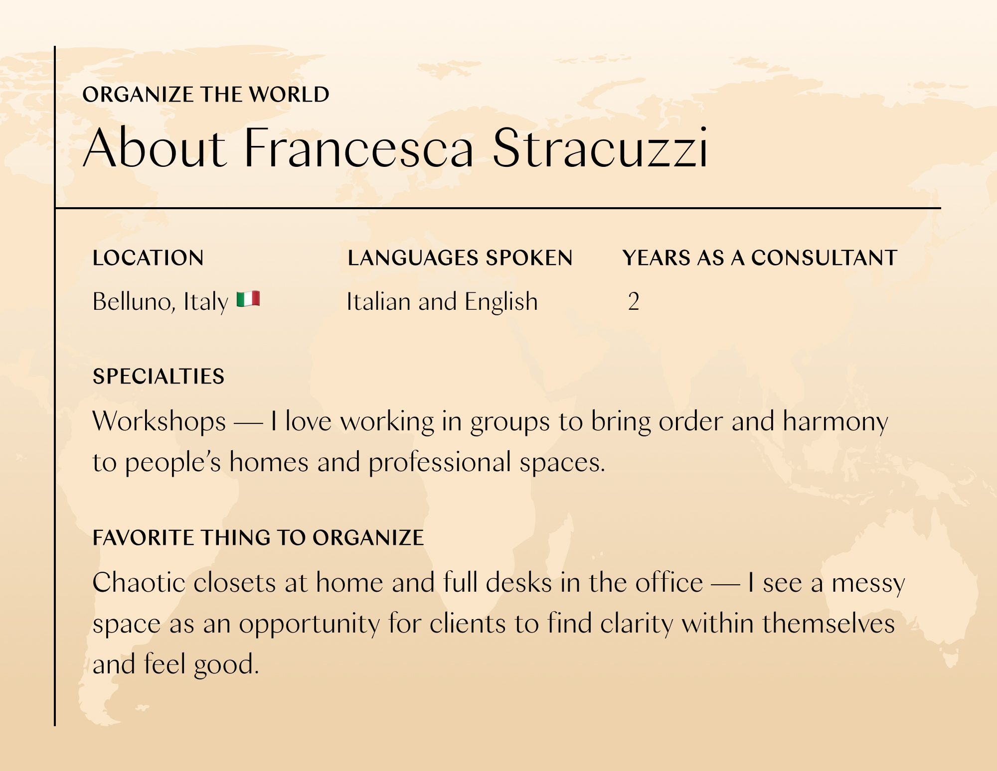 A natural, Francesca found her way to the KonMari Consultant Program, where she became certified in using the KonMari Method™ to support clients. In Italy, however, you cannot be employed by the government and run your own business. So, Francesca decided to take the leap and quit her career to start her own organizing business.